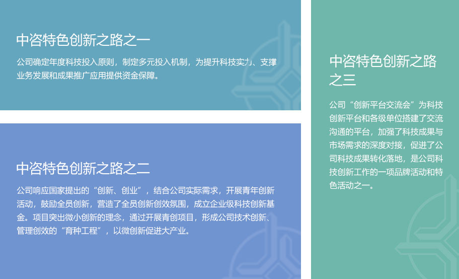 公司秉承“勇立潮頭、追求卓越”的開拓精神,堅(jiān)持科技創(chuàng)新和科技體制改革雙輪驅(qū)動(dòng),建立了五位一體,上下聯(lián)動(dòng)的,具有中咨特色的技術(shù)創(chuàng)新體系。